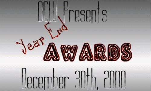 Prez Dean: Well, to wrap this show up, I would like to say that I have had so much fun with OCW this past year and I expect it to be even better next year. I look around and I see as bright of future as OCW has ever had. A year from now, who knows who we will be awarding, inducting or taking a look back on. That is the exciting part, but we have heard from the fans and now, let me tell all of you, personally who I think has helped OCW along the most this year. And without these guys, OCW would not be where it is today, or may not even be around at all. First, I would like to mention Scott Syren, the man who took OCW to another level. Before Syren, OCW was basically talentless, but Syren was able to elevate those around him and single handidly turned OCW into a much more competitive organization. Next, I wanna thank D Double D. He has been about as loyal to OCW as anyone you will ever see. Never complains, never whines or moans he just goes out, does his thing and as you can see, gets rewarded. Silverfreek, maybe the most helpful of all. This guy has helped me with creative ideas and he has helped me get out of jams time after time, without Silverfreek, I know OCW would not be here today. Curt Canon, always there to help, a great, loyal guy. Too bad he didn’t get in HOF this year…maybe 2001 will be the year for Curt Canon. Scorpion, always on time, always there when you need him. The guy is a machine. He definitely raised the bar of excellence in OCW another notch when he won Last Man Standing.