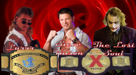 Logan: Yeah, it looks like they’re making good progress on getting the cage lowered into place. It’s time for the match that many have expected to be our show-stealer, although it isn’t going to be easy to top our opening match! These guys have a shot, though! Roll the clip! *The screen goes black for a second, then starts rolling. We see a shot of Lurrr, at the head of the Roman Empire, proudly displaying the X Division Title. The next shot shows The Lost Soul, shortly after winning the Intercontinental Title at Capital Punishment. The clips of matches begin to run, showing Lurrr putting the X Division Title up against “PIC” Steve Wilson. The competitive match is interrupted, first by “Friday The 13th” playing during an attempted Wilson maneuver, then by The Lost Soul himself, distracting Lurrr and allowing Wilson to get the win, taking away the title. Lurrr and The Lost Soul are shown wrestling the next week, with the IC Title on the line. Wilson, as the special referee, lets them get away with a lot, but still gets involved when needed. Late in the match, The Lost Soul is seen missing a move and hitting Wilson instead, knocking him down. This allowed Rick Mathis to get involved, and Lurrr to take the victory, becoming the IC Champion, with Wilson making the count. The three wrestlers are pictured, each seemingly looking upwards. An ominous shot of the steel cage is shown, followed by a fade to black. We return to the ring.*