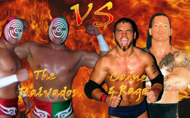 *The video clip begins, showing Scott Caine and “Twiztid” Arryk Rage coming out of the back, working together as a team for the first time. The Malvados come out with Paco as usual, looking to trick their way to a victory. Things didn’t turn out quite as planned for Paco’s team, though, as Caine & Rage were quickly on the attack, pulling off some surprising double-team maneuvers considering that they’ve never worked together before. Caine seemed to be shining the most, showing that he is no longer a rookie in the business. Although the Malvados tried their switch at one point, getting them back into it against Rage, Caine was able to get the hot tag and take out both men, including sending Hector Malvado over the top rope and taking a hard spill to the floor. With Hector injured and out of it, Victor was soon dominated, with Scott climbing up the turnbuckle and landing the Sugar Caine for the win. After the match, Hector was helped to the back by medical personnel.*