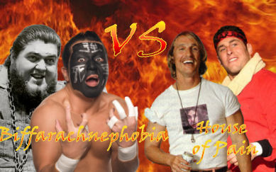 Rockwell: Then, in our main event, we’ve got Biffarachnephobia getting some revenge on the House of Pain in a “Tag Team Tables” Match!