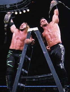 At the next Smackdown, in retribution for the loss, Vince McMahon arranged for Benoit & Jericho to defend the tag-team belts against the Hardy Boyz, the Dudleyz, and Edge & Christian in the third installment of the Tables-Ladders-Chairs matches. It was a spotfest, featuring all sorts of painful maneuvers, mainly featuring the ladders that were set up in the ring. At one point, Benoit tried to dive off the turnbuckle with his headbutt into Matt Hardy. Hardy moved, however, and Benoit took the full brunt of the shot into the table, knocking himself out. One of the announcers, Tazz, left the broadcast location and checked on him, then called for help, and Benoit was stretchered out, leaving Jericho to fight on alone. After more spectacular maneuvers left the other seven wrestlers in various conditions in and out of the ring, Benoit returned, grimacing from the pain in his ribs. He went for the gold (hanging from a ladder), but was stopped by Edge, who, with his partner Christian, delivered a ConChairTo to Benoit's ribs, injuring him more. Benoit then stayed down as the rest battled furiously for the gold. After Edge speared Jericho from the ladders, though, Benoit returned once more, pulling himself painfully up the ladder and grabbing the gold before anyone could muster enough energy to stop him. This allowed Benoit & Jericho to retain the titles, keeping them the dominant tag-team in the WWF.