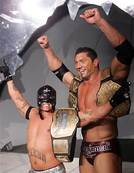 Mysterio & Batista soon were announced as challenging Kane & the Big Show at the next PPV. Before that, though, Mysterio & Batista had a WWE Smackdown Tag Titles Match against M-N-M. Although Melina tried to 'convince' Batista not to compete before the match, Batista soon joined Mysterio, and the two were too strong for M-N-M, with Mysterio getting the 619 on Nitro, while Batista took out Mercury with the Batista Bomb to win them the titles! Once again, Mysterio was the Smackdown Tag-Team Champion, with his fourth different partner in four reigns, proving his abilities in the tag-team ranks. The two wrestlers met Kane & the Big Show in a "Champions vs. Champions" Match at Armageddon '05. Mysterio was definitely the odd man out, compared to the other three massive men, but he proved he also had the most heart, taking it to the Raw Tag Champs. In the end, though, with Batista and the Big Show on the outside on the announce table, Mysterio was caught and Chokeslammed by Kane, losing the match.