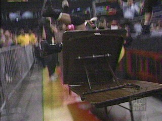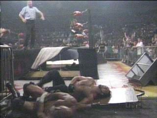 Kevin Nash about to Jackknife PowerBomb a masked wrestler through the canvas, as Hall looks on