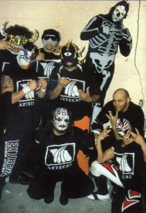 Numerous Luchadors pose in Aztecas t-shirts