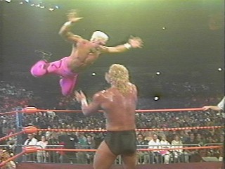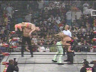 Lex Luger gives Rick Rude a free ride on the Torture Rack