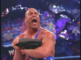 The Ankle Lock - This is now mostly known as Angle's main finisher, as he loves to put his opponent to shame by making them tap out. There's not much to explain here, really. With the opponent down on the mat, Angle locks onto their ankle, twisting it painfully in directions it was never meant to go. Angle can be tenacious when it comes to the hold, hanging on to it through rolls and turns, keeping the opponent from escaping.