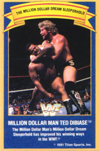 The Million Dollar Dream - DiBiase won many matches in his day with this variation of a Sleeper hold. With his opponent worn down from the course of the match, DiBiase would strike, locking his opponent in the Dream. While one arm holds his opponent's arm across his throat, the other arm reaches underneath to add to the pressure, eventually causing DiBiase's foe to pass out, ending the match. It's a shame that DiBiase never won the WWF World Title, because this hold surely would have made it believable.