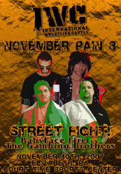 - The Gambino Brothers (Marshall Gambino & Mickey Gambino), as the IWC Tag-Team Champions, won a "Non-Title Street Fight" Match over BabyFace Fire (Jason Gory & Shiima Xion)
